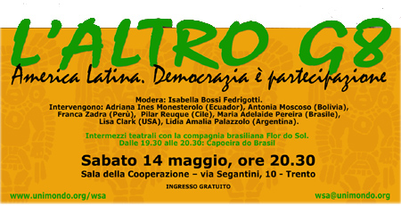 Un G8 quasi tutto latinoamericano dove i paesi dei movimenti indigeni, del bilancio partecipato dialogano con alcune rappresentanti della società civile degli Stati Uniti. L'Altro G8 diametralmente opposto al G8 che vede periodicamente incontrare 8 uomini, bianchi in rappresentanza degli 8 paesi più ricchi. Due visioni sottosopra; una dal basso e la seconda dall'alto, lo sviluppo sostenibile e quello sostenuto, il sud ed il nord accomunati da un divario che è sociale, economico, urbanistico, politico, insomma complesso. Al tavolo dei relatori siederanno quindi 8 donne americane, in rappresentanza di 8 realtà diverse che racconteranno i profondi cambiamenti economico-politici che attraversano le Americhe e le trasformazioni sociali che vedono nella donna una protagonista fondamentale ed ispiratrice di questa etica della comunità e della partecipazione politica. Dal micro al macro, il panel sarà composto da 8 donne, delle quali due che abitano in Trentino, 3 rappresentanti delle immigrati a livello nazionale, una testimone dall'America Latina e due statunitensi integrate nella realtà italiana. La partecipazione popolare, e quindi la democrazia, sarà l'oggetto della discussione politica.