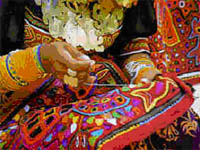 Completata la tintura, si legava la lana a una conocchia e la si filava, mentre i telai erano di tre tipi: quello da "asporto", con tirante a "dorso", o telaio a cintura dove un'estremità passa appunto attorno alla schiena della tessitrice (telaio riservato alle donne); il telaio posato a terra, con l'ordito retto da un bastone forcuto a circa 30 centimetri dal suolo, e il telaio verticale, appoggiato al muro, sul quale i tessitori, generalmente uomini, lavoravano in piedi. Gli Spagnoli avrebbero introdotto il telaio a pedale, ma gli indios non se ne innamorarono mai: lo usarono solo per stoffe di largo consumo, non per trame d'arte. Si tessevano tre tipi di lana: la più comune era la awaka; la più fine e finita da entrambe le parti era la kumpi; il tessuto più spesso e pesante (chusi) era una specie di panno con cui si facevano coperte e tende per porte. Alle donne erano affidate le lane più delicate, alpaca e vigogna. Fra gli elementi particolari nei disegni vi sono animali che ne contengono altri, il serpente circondato da stelle, la stella a otto punte e il tocapo, figure geometriche incastonate in quadri, rombi e rettangoli. L'Inca, il sovrano, portava le tuniche una sola volta, dopodiché dovevano essere distrutte. I suoi abiti di vigogna erano tessuti dalle "Elette", fanciulle abilissime nel tessere, belle e aggraziate che venivano portate al lavorare a Cuzco; esse confezionavano anche tuniche piumate. Tessevano poi tuniche con fili misti di lana e oro, vesti più "normali", per i notabili. L'artigianato oggi L'uso della lana di camelidi è tuttora una componente importante dell'artigianato utilitario e artistico andino. Fra le tecniche usate, caratteristica è la "spina di pesce", che avrebbe carattere magico e di protezione di chi indosserà il tessuto, risultato dell'equilibrio fra forze opposte. Le opere tessili attuali sommano motivi stratificati dalla storia. E così succede di trovare disegni su striscia che accanto ai tradizionali animali stilizzati precolombiani raffigurano aerei e auto, utilizzati in senso astratto e simbolico. Le tessitrici indie usano tuttora il fuso, mentre il telaio è a cinghia o a 4 pioli che tengono teso l'ordito, entrambi leggeri e trasportabili, che permettono di lavorare anche lontano da casa, negli intervalli dei lavori agricoli o della cura degli animali al pascolo: basta un albero a cui fissare un'estremità, o un piccolo spiazzo dove piantare i pioli. In Perù l'artigianato è prevalentemente un'arte da poveri, lasciata per lo più in mano ai contadini indios quechua e aymara, il 50% dell'attuale popolazione peruviana. I popoli della sierra, che si dedicano quasi esclusivamente all'allevamento e alla pastorizia, costretti a rimanere al pascolo per tutto il giorno, per far trascorrere il tempo prendevano i fili e li intrecciavano: sono nati così i bracciali, che in forma sempre più variopinta sono diventati alla "moda", raggiungendo il mercato occidentale. Animatore David Hancco è originario di Puno, nella sierra sudorientale del Perù. Artigiano; è esperto di metalli e tessuti e riproduce nel suo laboratorio gioielli nello stile maya e inca. Nel laboratorio "Intreccio di colori" ci accompagnerà nella realizzazione di bracciali colorati andini, utilizzando il corpo come telaio. |